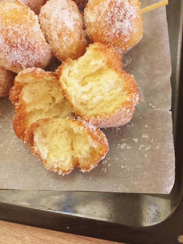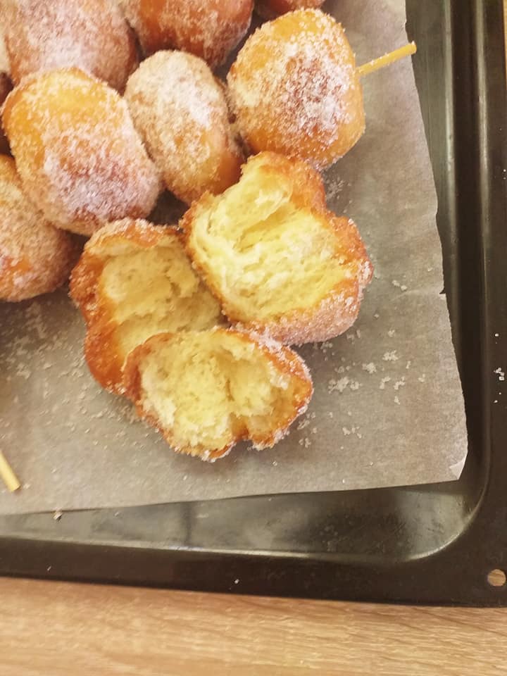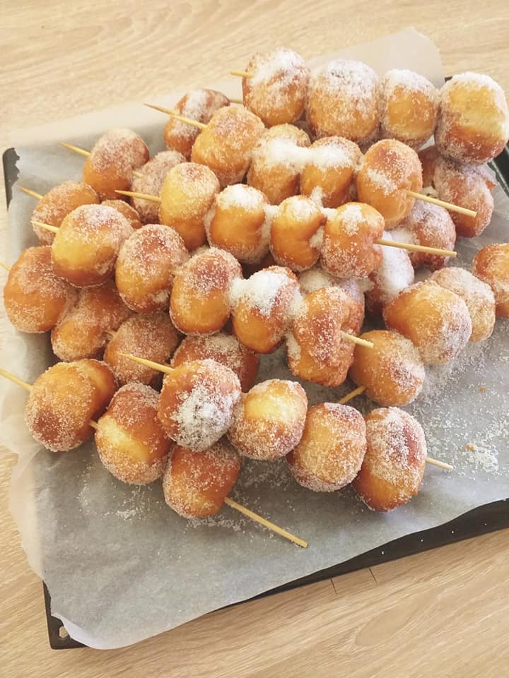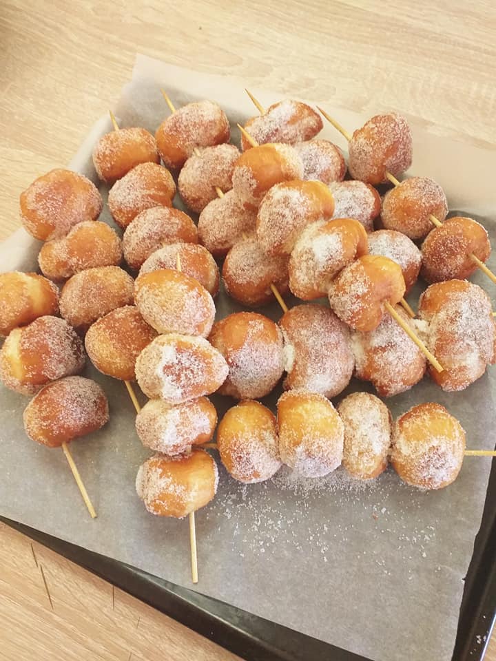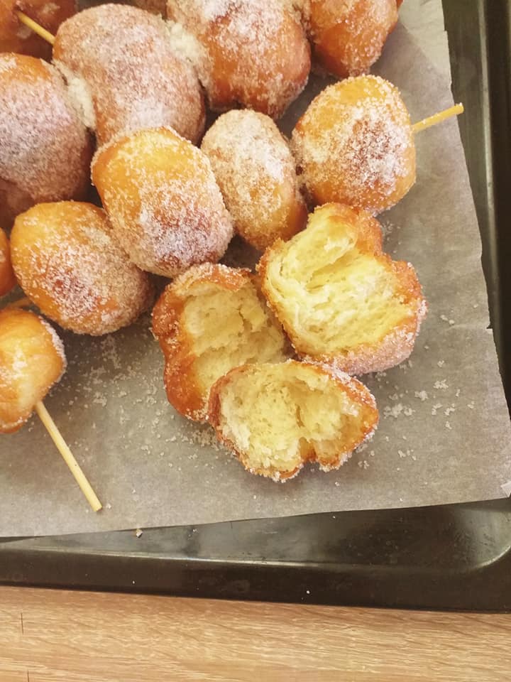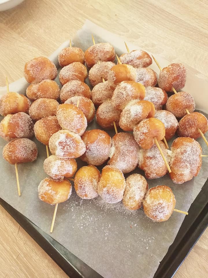 Παίρνουμε ένα ταψί και τοποθετούμε μέσα σε αυτό μια λαδόκολλα. Αφού προσθέσουμε τα σουβλάκια μας, τα αφήνουμε να φουσκώσουν για 30 λεπτά ακόμη. Τέλος, τα τηγανίζουμε σε καλά ζεσταμένο ηλιέλαιο ή σπορέλαιο από όλες τις πλευρές. Τα βουτάμε σε ζάχαρη ή λιωμένη σοκολάτα και τα απολαμβάνουμε!
