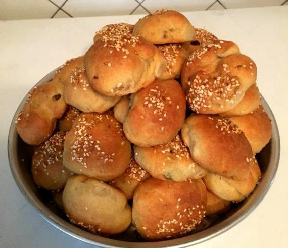 Κάνω την ζύμη με όλα τα υλικά και την αφήνω να φουσκώσει . Στην παλάμη ανοίγω λίγο ζυμαράκι βάζω μέσα λίγες ελιές και πιπεριές και τα πλάθω στρογγυλά! Αφού βάλω λίγο σουσάμι από πάνω τα ψήνω για 45 λεπτά στους 180-200 βαθμούς .