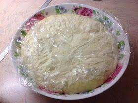 την σκεπάζουμε με μεμβράνη και με μία πετσέτα κουζίνας, (τώρα το καλοκαίρι με τόση ζέστη φουσκώνει και σε θερμοκρασία δωματίου σε καμιά ωρίτσα.