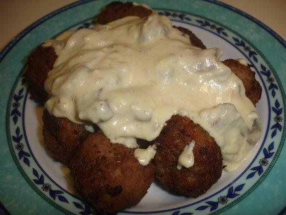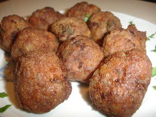 Ζυμώνουμε πολύ καλά όλα μαζί τα υλικά σε ένα μπώλ. Τα πλάθουμε σε μικρά κεφτεδάκια, τα πασπαλίζουμε με αλεύρι και τα τηγανίζουμε σε σιγανή φωτιά, αφού έχει κάψει το λάδι, για να μη σκληρύνει η επιφάνειά τους. Καθώς τηγανίζουμε τα γυρίζουμε συνεχώς με τρυπητή κουτάλα και όχι με το πηρούνι ένα- ένα όπως κάνουμε με τους κεφτέδες. Μόλις ροδίσουν ελαφρά τα βγάζουμε στην πιατέλα.