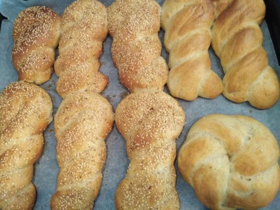 Αφού η ζύμη διπλασιαστεί λαδώνουμε τα χέρια μας και χωρίζουμε την ζύμη σε κομμάτια. Πλάθουμε το κάθε κομμάτι σε πλεξούδα. Αλείφουμε την κάθε πλεξούδα με 1 κουταλάκι του γλυκού μέλι το οποίο το έχουμε διαλύσει σε ένα φλιτζάνι χλιαρού νερού. Πασπαλίζουμε με σουσάμι και ψήνουμε στον αέρα, στους 180 βαθμούς Κελσίου, μέχρι να ροδίσουν.