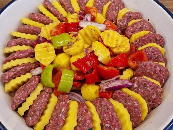 Εμείς το φτιάξαμε με απλά Μπιφτεκάκια με πατάτες στον φούρνο, Αλλά παρακάτω σου έχω και την αυθεντική συνταγή για Fırında Patatesli İnegöl Köfte . Είναι μία πανδαισία χρωμάτων, αρωμάτων και γεύσεων και συνοδεύεται τέλεια με φέτα, ψωμί και παγωμένη μπύρα.