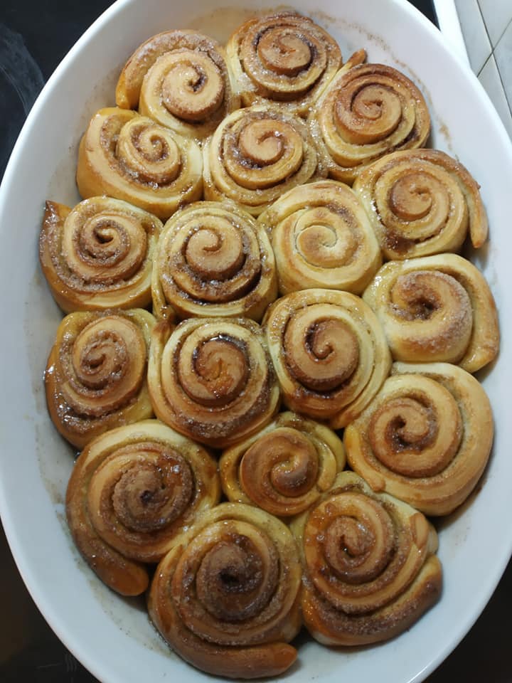 Αλείφουμε με το βούτυρο και ρίχνουμε το μείγμα της ζάχαρης με την κανέλα. Πασπαλίζοντας. Κλείνουμε σε ρολό κι αρχίζουμε και κόβουμε ισομεγέθη ρολά. Καλό είναι τις δύο άκρες να τις κόβουμε πρώτες και μετά να κόβουμε στην μέση και ξανά μέση.