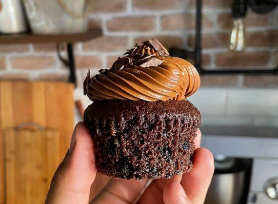 Προσθέτουμε το μείγμα των στερεών στο μείγμα των υγρών και ανακατεύουμε μέχρι να ομογενοποιηθούν. Σε ένα ταψάκι για cupcakes, στρώνουμε 12 χαρτάκια για cupcakes και γεμίζουμε τα 2/3 κάθε θέσης.