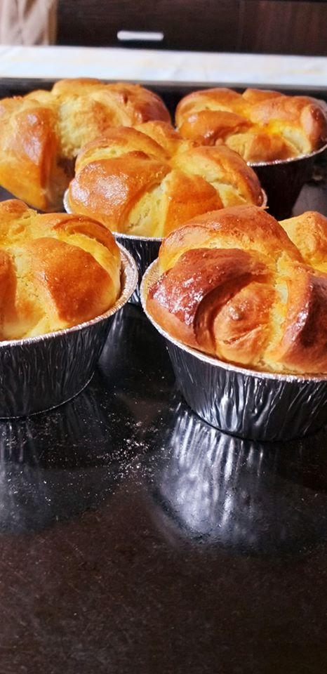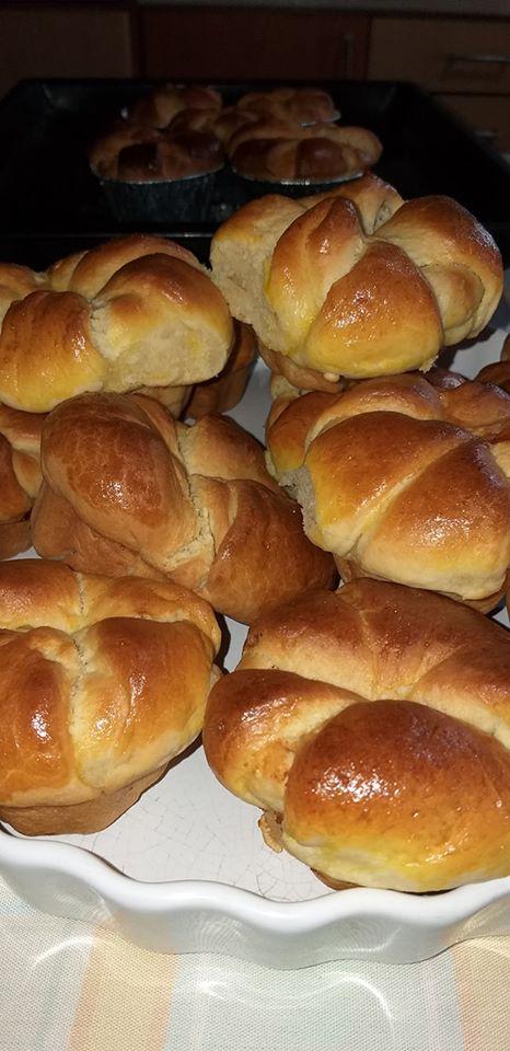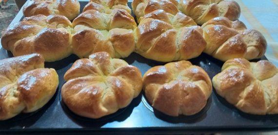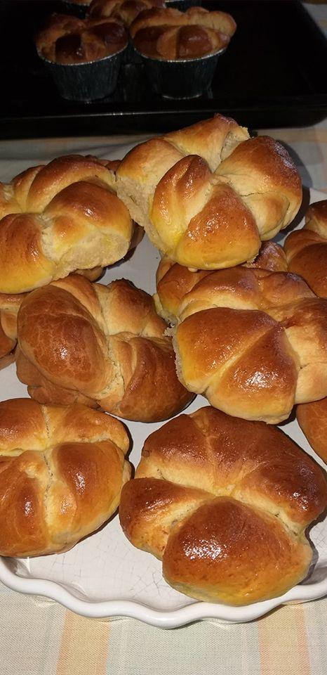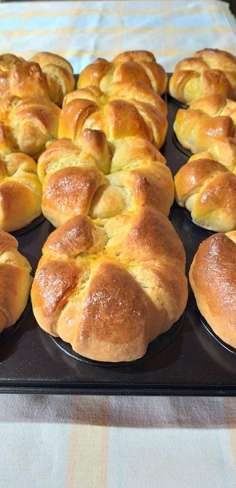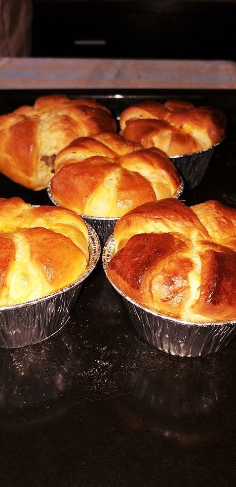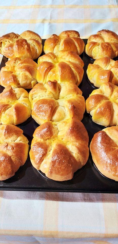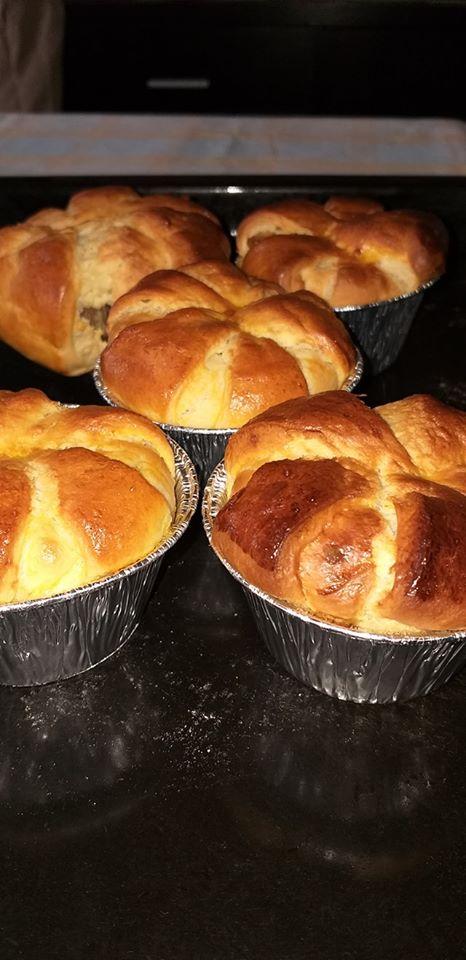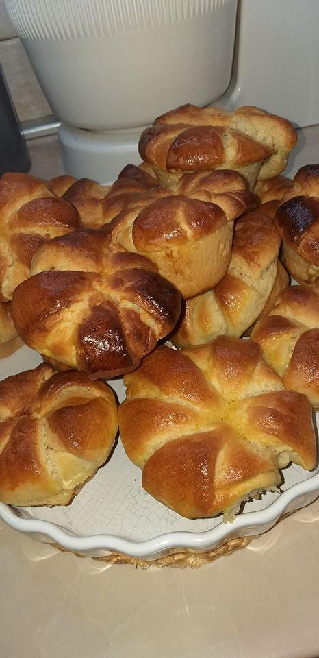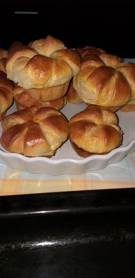 Σε λεκάνη προσθέτω ένα ένα τα υλικά και ζυμώνω. Αφήνω την ζύμη να ξεκουραστεί και να τριπλασιαστεί σε όγκο. Την τοποθετώ σε ξύλινη επιφάνεια η πάγκο την ξεφουσκώνω την πλάθω ελαφρώς σε μακρόστενο ζυμάρι και την χωρίζω σε 16 ίσα κομμάτια. Παίρνω ένα ένα και με την βοήθεια του πλάστη και λίγο αλευράκι ανοίγω μικρά φυλλαράκια. Στην μια άκρη βάζω φέτα τριμμένη κατά μήκος και στην άλλη την χαράσω σε 4 σημεία όπως κάνουμε στα ατσμα. Κλείνω την γέμιση ρολλάρω και κλείνω στρογγυλά. Τοποθετώ στις θήκες ταψιού για μάφινς αφού τις λαδώσω. Αλείφω με χτυπημένο αυγό επάνω και ψήνω σε καλά προθερμασμένο φούρνο πάνω κάτω αντιστάσεις στους 200° έως ότου ροδίσουν. Μπορούμε να τα κάνουμε και με γλυκιά γέμιση π.χ μαρμελάδα ή πραλίνα φουντουκιού, φαντασία να υπάρχει!
