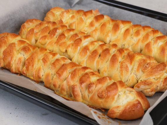Κόβουμε δεξιά και αριστερά, τον ίδιο αριθμό από λωρίδες και δίνουμε σχήμα όπως θα δείτε και στο βίντεο παρακάτω. Βάζουμε τα τυρόψωμα σε ένα ταψί με λαδόκολλα και τα αλείφουμε με τους χτυπημένους κρόκους. Ψήνουμε στους 180 βαθμούς Κελσίου, στις αντιστάσεις, μέχρι να ροδίσουν.