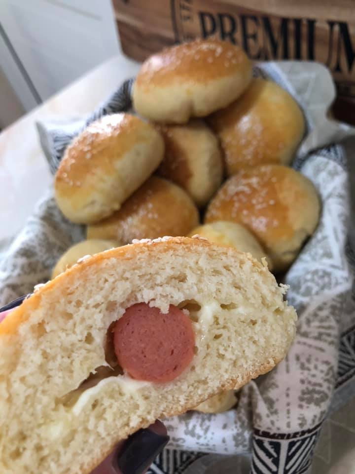 Κάνουμε το ίδιο για όλη τη ζύμη. Τα αφήνουμε να φουσκώσουν σε ζεστό μέρος για 25 λεπτά. Τέλος αλείφουμε με 1 αυγό ανακατεμένο με 2 κ.σ γάλα και ψήνουμε για 25 λεπτά στους 200 βαθμούς. Εγώ έκανα τα μισά με φέτα και τα αλλά μισά με λουκανικάκι κοκτέιλ και γκούντα.