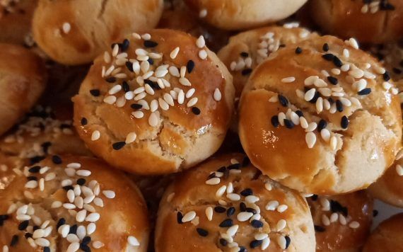 Έπειτα πλάθουμε την ζύμη σε μικρά μπαλάκια και τα τοποθετούμε σε ένα ταψί με λαδόκολλα. Χτυπάμε τον κρόκο αυγού και τα αλείφουμε. Πασπαλίζουμε με σουσάμι και μαυροσούσαμο και ψήνουμε στους 180 βαθμούς Κελσίου για 25-30 λεπτά.