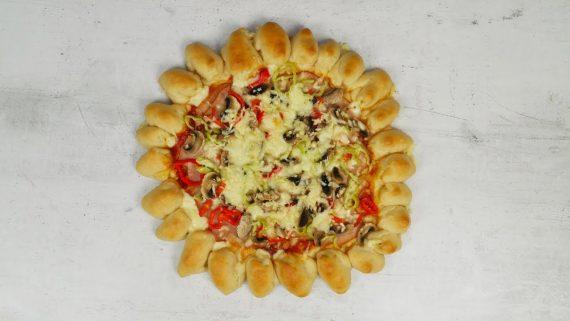 Αναμειγνύουμε την μαγιά με την ζάχαρη και το χλιαρό γάλα. Προσθέτουμε σπορέλαιο και σιγά σιγά το αλεύρι μέχρι που να γίνει ζύμη. Όταν είναι έτοιμη την σκεπάζουμε και την αφήνουμε για 30 λεπτά να ξεκουραστεί. Την πλάθουμε ελαφρώς και την ανοίγουμε φύλλο σε αντικολλητικό χαρτί. Στην αρχή την ανοίγουμε με τα χέρια και έπειτα με τον πλάστη. Με την δοσολογία που σας δίνουμε μπορείτε να φτιάξετε 2-3 πίτσες. Περιμετρικά τοποθετούμε μπαστούνια από κίτρινο τυρί και τα σκεπάζουμε με την ζύμη. Κόβουμε σε μικρότερα κομμάτια, τα γυρνάμε 90 μοίρες και σφραγίζουμε τις άκρες για να μην χυθεί το τυρί. Ετοιμάζουμε την γεύση που μας αρέσει, εμείς χρησιμοποιήσαμε σάλτσα ντομάτας, ρίγανη, καπνιστή γαλοπούλα, πολύχρωμες πιπεριές, φρέσκα μανιτάρια και τριμμένο κίτρινο τυρί. Ψήνουμε στους 200 βαθμούς μέχρι να ροδίσει.