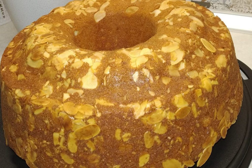 Αφού ομογενοποιηθεί το μείγμα το βάζουμε σε φόρμα για κέικ την οποία την έχουμε βουτυρώσει και της έχουμε στρώσει αμύγδαλα. Βάζουμε από πάνω το μείγμα και ψήνουμε στους 170 βαθμούς Κελσίου, στις αντιστάσεις για περίπου 40 λεπτά. Σας άρεσε αυτή η συνταγή; Πείτε μας στα σχόλια.
