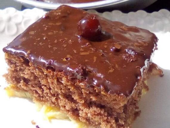 Κέικ με μπανάνες, καρύδια και μερικά ακόμη απλά υλικά επικαλυμμένο με λιωμένη κουβερτούρα. Είναι ένα αφράτο γλυκό που λιώνει στο στόμα, ιδανικό για τους λάτρεις της σοκολάτας. Είναι ένα γλυκό που μπορούμε να το απολαύσουμε όλο τον χρόνο και σίγουρα θα το λατρέψετε.