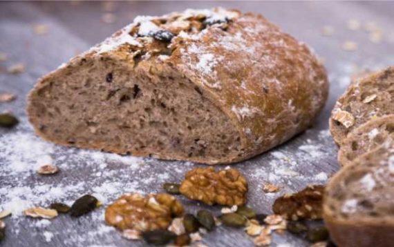 350 γρ. αλεύρι ολικής άλεσης 100 γρ. νιφάδες βρώμης 1 κουταλάκι του γλυκού αλάτι 1 φακελάκι μαγιά ξηρή (8 γρ.) 1 κουταλιά ψιλοκομμένα ξερά μυρωδικά της αρεσκείας σας (προαιρετικά) 75 γρ. καρύδια ψιλοκομμένα 300 ml χλιαρό νερό 2 κουταλιές της σούπας ελαιόλαδο λιόσπορους (ή άλλους σπόρους της αρεσκείας σας), νιφάδες βρώμης για το γαρνίρισμα