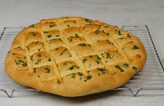 Όταν είναι έτοιμη την πλάθουμε ελαφρώς και την ανοίγουμε σε χοντρό φύλλο. Την βάζουμε σε ταψί με αντικολλητικό χαρτί. Δουλεύουμε το σκόρδο με λίγο ελαιόλαδο και αλείφουμε την ζύμη. Την χωρίζουμε σε τετράγωνα κομμάτια. Προαιρετικά πασπαλίζουμε ψιλοκομμένο μαϊντανό.