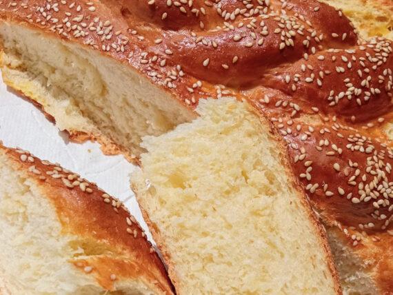 Σκεπάζουμε το ψωμί για 25 λεπτά και έπειτα το αλείφουμε με χτυπημένο κρόκο αυγού, που τον έχουμε χτυπήσει με το φρέσκο γάλα. Πασπαλίζουμε με σουσάμι και ψήνουμε στους 180 βαθμούς Κελσίου, σε προθερμασμένο φούρνο, στη μεσαία σχάρα για 30 λεπτά.
