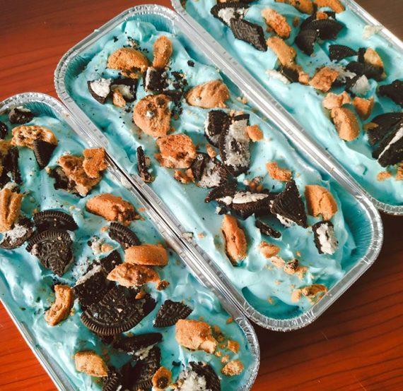 Χτυπάμε την κρεμά γάλακτος, μαζί με τις βανίλιες και το μέλι σε σαντιγί. Πριν σφίξει πολύ η σαντιγί, στα μισά περίπου ρίχνουμε το ζαχαρούχο γάλα και το μπλε χρώμα ζαχαροπλαστικής και συνεχίζουμε το χτύπημα. Μετά σπάμε τα μπισκότα σε μικρά κομμάτια (κρατάμε λίγα για το γαρνίρισμα) και τα προσθέτουμε και αυτά.