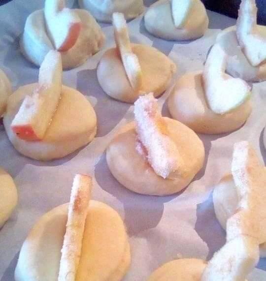 Κόβουμε τα μήλα σε φέτες τις τοποθετούμε σε μπολ μαζί με την ζάχαρη και 1 κουταλάκι του γλυκού κανέλα. Οπότε τοποθετούμε πάνω σε κάθε δισκάκι μια φέτα μήλο και το κλείνουμε και τα τοποθετούμε στην σειρά στο ταψί. Τα αφήνουμε 15 λεπτά. Τέλος τα αλείφουμε με κρόκο αυγού και ψήνουμε στους 180 βαθμούς σε προθερμασμένο φούρνο στις αντιστάσεις στην μεσαία σχάρα για 45 λεπτά φυσικά ανάλογα τον φούρνο.