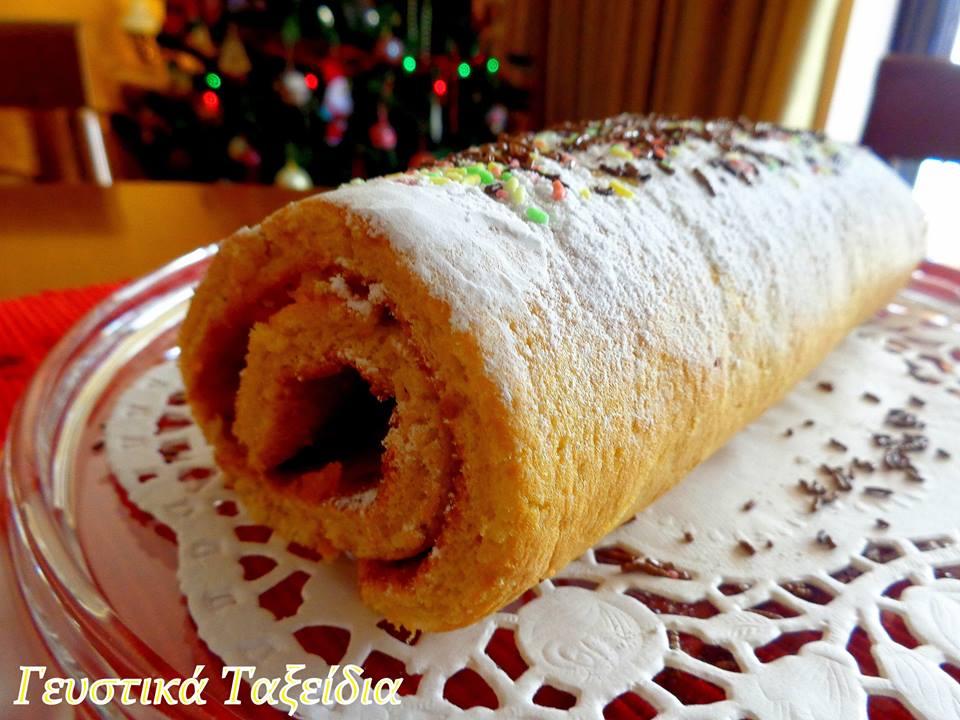 3) Απλώνετε ομοιόμορφα τό μείγμα στό ταψάκι καί τό ψήνετε 10 μέ 12 λεπτά. Αναποδογυρίζετε τό παντεσπάνι σέ καθαρή πετσέτα πασπαλισμένη μέ ζάχαρη καί ξεκολάτε τό λαδόχαρτο. Σκεπάζετε τό παντεσπάνι μέ καθαρό λαδόχαρτο. Τυλίγετε τό παντεσπάνι όσο είναι ακόμη ζεστό καί μέ τή βοήθεια τής πετσέτας σέ ρολό. Aφήνετε τό παντεσπάνι νά κρυώσει.