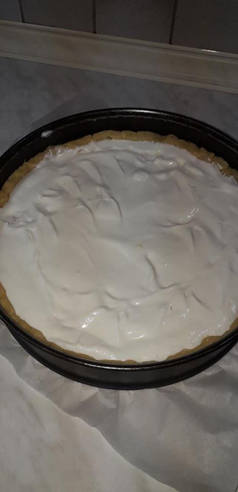 Βάζουμε όλα μαζί όλα τα υλικά της ζύμης σε ένα δοχείο και τα μαλάζουμε να ενωθούν, μέχρι να μην κολλάει η ζύμη στα τοιχώματα. Την αφήνουμε να ξεκουραστεί για μισή ώρα και την βάζουμε ανάμεσα σε δύο κομμάτια αντικολλητικό χαρτί και την ανοίγουμε με τη βοήθεια ενός πλάστη σε διάμετρο όσο να χωράει στη βάση του ταψιού μας και να καλύπτει και το μισό περίπου από το τοίχωμα. Με τη βοήθεια του αντικολλητικού χαρτιού την τοποθετούμε μέσα στο ταψί.