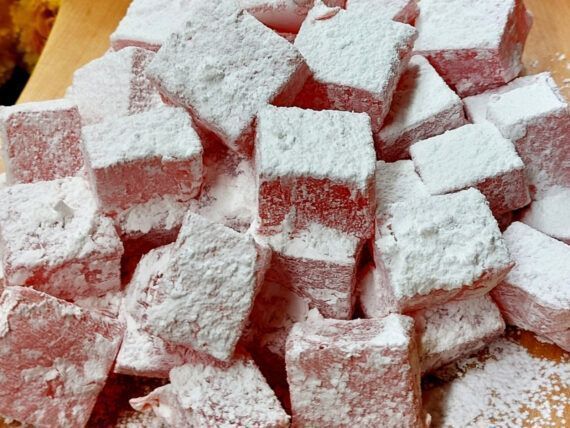 Στη συνέχεια, προσεκτικά κόβουμε περιμετρικά τις άκρες γύρω από το τσέρκι. Γυρίζουμε ανάποδα και κοσκινίζουμε ξανά από το μείγμα ζάχαρης άχνης και κορν φλάουρ. Τέλος, κόβουμε τα λουκούμια σε κύβους.