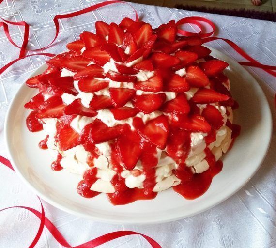 Υλικά: 4 ασπράδια αυγών, σε θερμοκρασία δωματίου μία πρέζα περίπου αλάτι 250 γραμμ. ζάχαρη 2 κ.γ. κορν φλάουερ 1 κ.σ. λευκό ξίδι Λίγες σταγόνες υγρή βανίλια η 2 κάψουλες 300 γραμμ. κρέμα γάλακτος, χτυπημένη σε σαντιγί 250 γραμμ. φράουλες.