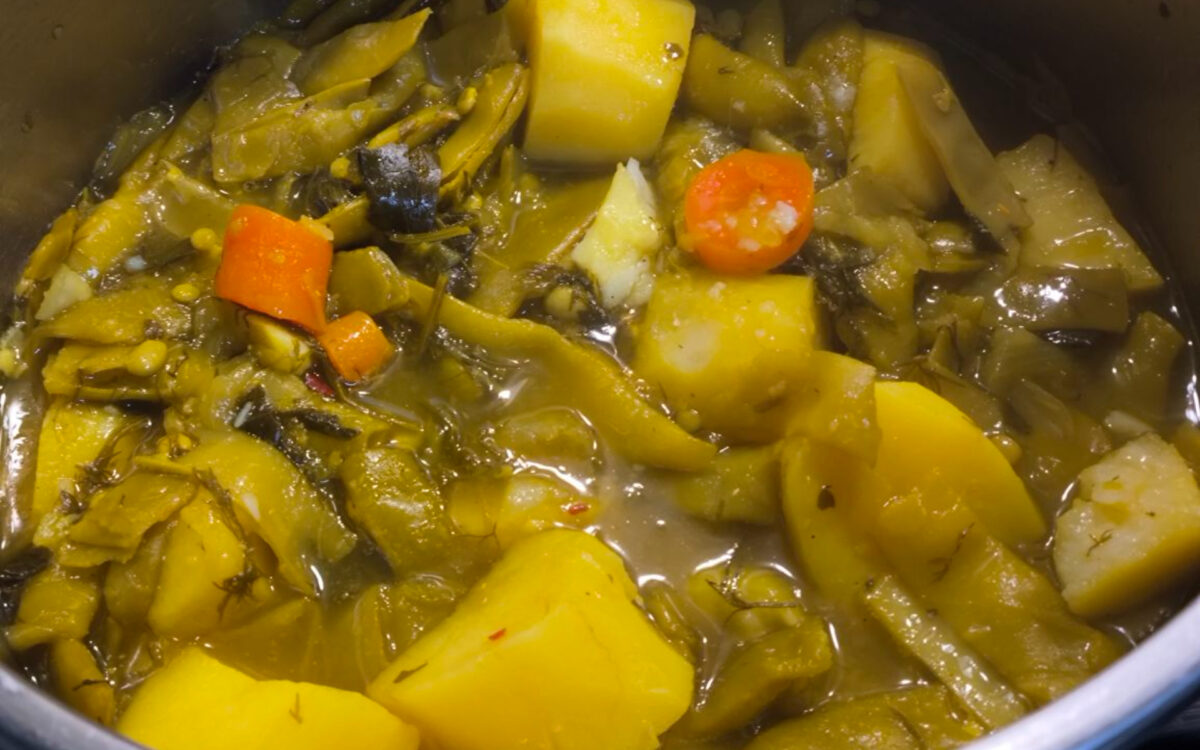 Καθαρίζουμε και πλένουμε καλά τα φασολάκια, τα κρεμμυδάκια, το καρότο και τις πατάτες. Κόβουμε τα λαχανικά σε κομμάτια. Τα τοποθετούμε σε κατσαρόλα και προσθέτουμε λίγο νερό, το λευκό κρασί, το μπούκοβο, το πιπέρι και τον κουρκουμά. Αφήνουμε το φαγητό να σιγοβράσει μέχρι να μαλακώσουν καλά τα λαχανικά.