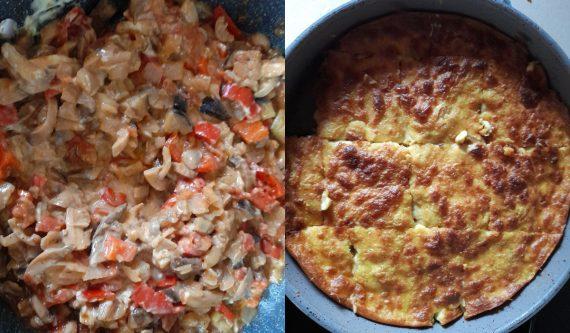 Αρχικά ψιλοκόβουμε το κρεμμύδι, κόβουμε τις μελιτζάνες σε κύβους, τις πιπεριές Φλωρίνης σε κύβους και βάζουμε ένα αντικολλητικό τηγάνι να κάψει πολύ. Βάζουμε πρώτα τις μελιτζάνες να μαραθούν. Στην συνέχεια προσθέτουμε το κρεμμύδι, τις πιπεριές και τα μανιτάρια.