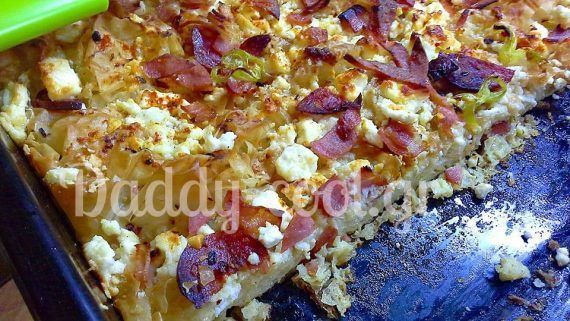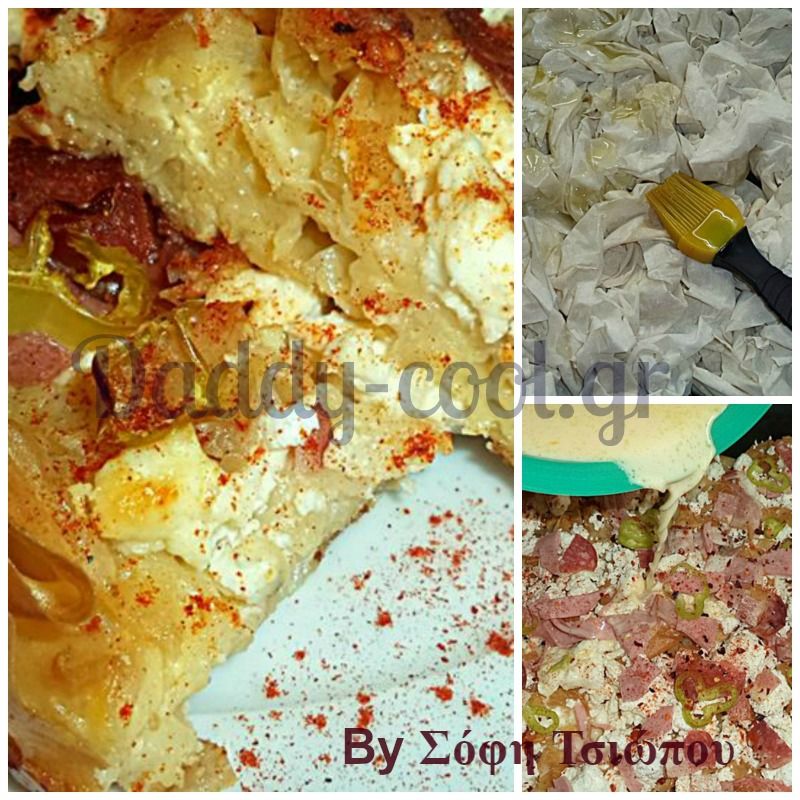 Αλμυρή πατσαβουρόπιτα σαν…”πίτσα”!!! Μια φανταστική πιτούλα με αμέτρητες παραλλαγές στα υλικά!!! Εγώ φτιάχνω αυτή με τα αγαπημένα μου υλικά. ΥΛΙΚΑ για το μεγάλο ταψί του φούρνου 1 πακέτο φύλλο κρούστας 4 αυγά 3 κούπες γάλα φρέσκο 300-400 γρ.τυρί φέτα χοντροτριμμένη 3 φέτες μπέικον σε κυβάκια 3 φέτες σαλάμι αέρος σε κυβάκια 1 πιπεριά σε ροδελίτσες 1/2 κ.γ πάπρικα γλυκιά σκόνη 1 κ.γ πάπρικα γλυκιά σε νιφάδες 1/2 κούπα ελαιόλαδο ΕΚΤΕΛΕΣΗ -Στο μεγάλο ταψί της κουζίνας αφού το λαδώσω καλά,στρώνω σουφρωμένα ένα-ένα τα φύλλα μου.Τα λαδώνω πολύ καλά με τη μισή κούπα λάδι και ψήνω στους 180 για 8-10 λεπτά να πάρουν λίγο χρώμα. Βγάζω το ταψί από το φούρνο και ρίχνω σε όλη την επιφάνεια όλα τα υλικά.Καλύτερα να βάλετε πρώτα όλα τα αλλαντικά να χωθούν καλά μέσα στα φύλλα για να μην αρπάξουν στο ψήσιμο και από πάνω το τυρί.Πασπαλίζω με την πάπρικα σκόνη και τις νιφάδες. -Σ’ένα μπολ ρίχνω το γάλα και τα αυγά και χτυπάω με ένα σύρμα. Αλάτι εγώ δεν βάζω,αλλά αν το τυράκι σας δεν είναι πολύ αλμυρό,ρίξτε λίγο!Πιπέρι επίσης δεν βάζω γιατί δεν μου ταιριάζει στη γεύση μου. Βάζω πάλι το ταψί στο φούρνο και ψήνω περίπου 10-15 λεπτάκια ακόμα ή ώσπου να ροδοκοκκινήσει καλά η πίτα μου. Ο γιος μου τρελλαίνεται να παίρνει μαζί του για κολατσιό στο σχολείο!!!