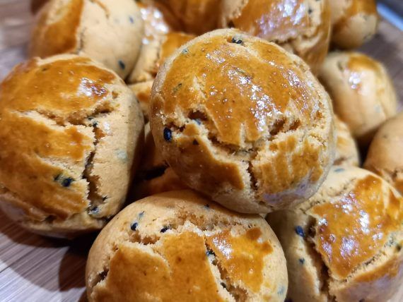 Στο τέλος προσθέτουμε το αλεύρι για όλες τις χρήσεις και δουλεύουμε το μείγμα μας μέχρι η ζύμη να είναι αφράτη, να πλάθεται εύκολα και να μην κολλάει στα χέρια. Πλάθουμε τότε από την ζύμη μικρά μπαλάκια που έχουν το μέγεθος ενός καρυδιού και αλείφουμε το κάθε μπαλάκι με τον χτυπημένο κρόκο αυγού που τον έχουμε διαλύσει σε λίγο νερό.