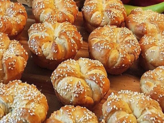 Επαναλαμβάνουμε την ίδια διαδικασία και με τα υπόλοιπα μπαλάκια ζύμης. Έπειτα τα αφήνουμε για λίγα λεπτά και πάλι να φουσκώσουν, σκεπασμένα σε ζεστό μέρος. Τα αλείφουμε με τον χτυπημένο κρόκο αυγού, πασπαλίζουμε με σουσάμι και ψήνουμε στους 200 βαθμούς Κελσίου, στις αντιστάσεις, μέχρι να ροδίσουν.