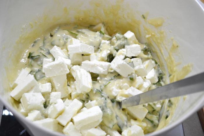 Προσθέστε το αλεύρι και ανακατέψτε με ένα κουτάλι απαλά μέχρι να ενωθούν όλα τα υλικά. Βάλτε και τη φέτα και ανακατέψτε πάλι, δε χρειάζεται πολύ χτύπημα. Η ζύμη είναι αρκετά ρευστή. Μοιράστε το μείγμα στα φορμάκια και ψήστε για 20 λεπτά περίπου μέχρι να πάρουν χρώμα και μια οδοντογλυφίδα να βγαίνει στεγνή από το κέντρο τους.
