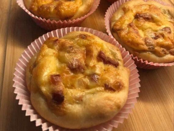 Την αφήνουμε να φουσκώσει σκεπασμένη σε ζεστό μέρος για τουλάχιστον 30 λεπτά και στην συνέχεια χωρίζουμε την ζύμη σε θήκες μάφινς και ανοίγουμε το ζυμαράκι σε φυλλαράκι με τα χέρια μας. Ανακατεύουμε το κασέρι με το μπέικον το οποίο το είχαμε σοτάρει προηγουμένως σε ένα αντικολλητικό τηγάνι μέχρι να πάρει χρώμα και το έχουμε ψιλοκόψει.