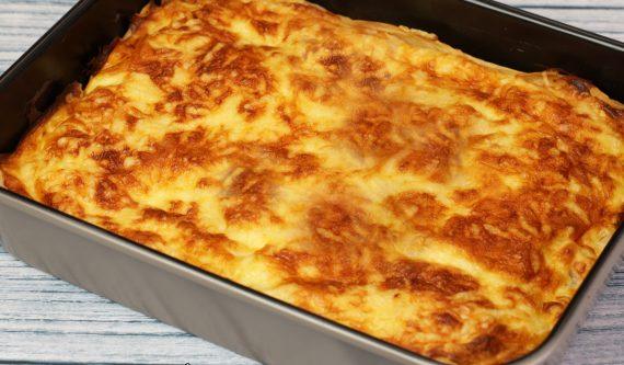 Αλείφουμε με το μείγμα από το γιαούρτι που μας έχει απομείνει, πασπαλίζουμε με τριμμένο κίτρινο τυρί και ψήνουμε στους 200 βαθμούς Κελσίου στις αντιστάσεις για 20-25 λεπτά.
