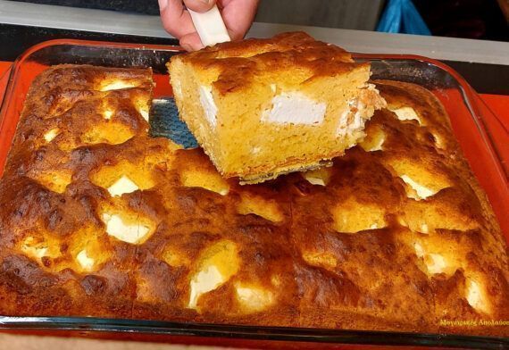 40g of sugar 5 eggs 7g of salt 300g warm milk 100g corn oil 200g of flour 400g of yogurt 20g of baking powder 400g corn flour 1 tsp soda with juice from half a lemon 300g of feta cheese 150g parmesan or some graviera Pan 25×35 Bake at 170 air or 180 resistances for approximately 45-50 minutes