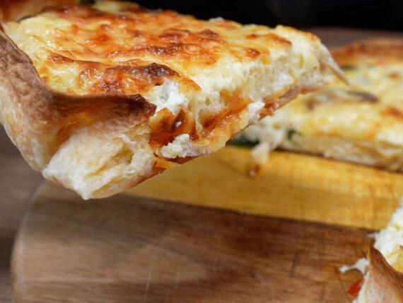 Συνταγή για αλμυρή τάρτα με μανιτάρια, τυριά και γιαούρτι με φύλλο τορτίγιας, σαν σουφλέ. Είναι τόσο αφράτη που θυμίζει κις λορέν και είναι η τέλεια επιλογή για αρχάριες μαγείρισσες. Από τον Δημήτρη Μιχαηλίδη.
