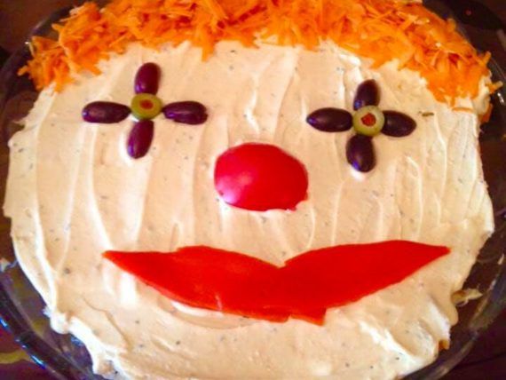 Κόβουμε τις ελιές στα δύο, αφαιρούμε το κουκούτσι και τις τοποθετούμε για μάτια του κλόουν. Στη μέση του ματιού βάζουμε από 1/2 γεμιστή πιπεριά. Βάζουμε τις πιπεριές για στόμα και την ντοματούλα για μύτη. Στο τέλος προσθέτουμε το καρότο για μαλλιά.