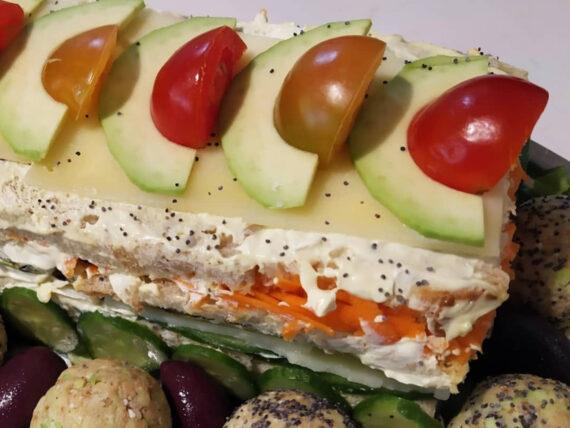 Αλείφουμε από πάνω λίγη ακόμη σαλάτα κηπουρού και επαναλαμβάνουμε την ίδια διαδικασία μέχρι να φτάσουμε τη τούρτα μέχρι πάνω και να τελειώσουν τα υλικά μας. Κλείνουμε με ψωμί του τοστ και σαλάτα κηπουρού. Αφήνουμε την τούρτα στο ψυγείο μέχρι να παγώσει καλά.