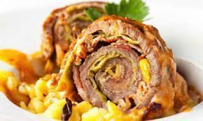 Σοτάρουμε όλα τα λαχανικά μαζί σε ένα τηγάνι με λίγο ελαιόλαδο έως ότου μαλακώσουν. Ρίχνουμε αλάτι, πιπέρι και τη μουστάρδα. Έπειτα ανοίγουμε τη φέτα του κρέατος και τα γεμίζουμε με τα σοταρισμένα λαχανικά, πασπαλίζουμε με το τυρί και ρολάρουμε το μοσχαράκι (το δένουμε με σπάγκο). Το τοποθετούμε σε ένα ταψί με 3-4 ποτήρια νερό και ένα λεμόνι στυμμένο. Το σιγοψήνουμε σε μέτρια θερμοκρασία για 1 ώρα περίπου. Αφού ψηθεί το κόβουμε λεπτές φέτες και το σερβίρουμε με πατάτες τηγανιτές, πουρέ ή ρύζι.