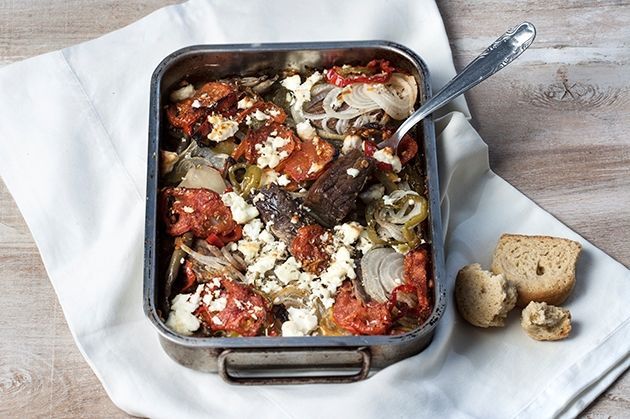 Ψήνουμε σε δυνατό προθερμασμένο φούρνο στους 250ºC στις αντιστάσεις για 30′ και χαμηλώνουμε στους 160ºC. Σιγοψήνουμε το φαγητό σε χαμηλό φούρνο για περίπου 2.45′ ώρες. Στις 2.15′ ώρες ψησίματος ξεσκεπάζουμε και σκορπάμε τα κομμάτια φέτας. Αφήνουμε να σιγοψηθεί στο φούρνο για τα επόμενα 30′, να λιώσει η φέτα και να μείνει σχεδόν με το λάδι του.