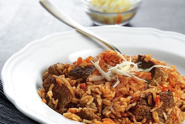 Συμπληρώνουμε νερό ή ζωμό κρέατος ίσα που να μισοσκεπάζει το κρέας. Κλείνουμε γύρω γύρω με αλουμινόχαρτο την κατσαρόλα και βάζουμε καπάκι. Χαμηλώνουμε τη φωτιά -μέτρια- και σιγοβράζουμε για 1 ώρα και 10΄. Δοκιμάζουμε το κρέας, πρέπει σε αυτό το στάδιο να είναι μαλακό και να έχει δέσει η σάλτσα του. Τότε προσθέτουμε το ρύζι και το νερό, αλατοπιπερώνουμε και σιγοβράζουμε με τη κατσαρόλα μισοσκεπασμένη. Όταν εμφανισθούν τρυπούλες στην επιφάνεια του ρυζιού -μετά από 15΄-20΄- σβήνουμε τη φωτιά. Σκεπάζουμε με καθαρή πετσέτα το φαγητό και βάζουμε καπάκι. Αφήνουμε το πιλάφι να σταθεί για 10΄-15΄. Η πετσέτα θα απορροφήσει την υγρασία και το ρύζι θα παραμείνει σπυρωτό. Σερβίρουμε με κεφαλοτύρι ή με γιαούρτι.