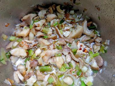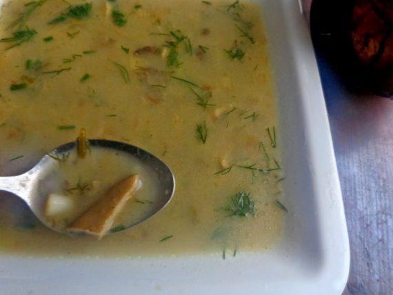 Σε μία κατσαρόλα βάζουμε το βούτυρο με τα ψιλοκομμένα κρεμμυδάκια και ανακατεύουμε μέχρι να μαραθούν . Προσθέτουμε τα μανιτάρια κομμένα σε φετούλες και σοτάρουμε για μερικά λεπτά. Στην συνέχεια προσθέτουμε το ζεστό ζωμό αλάτι και πιπέρι. Τα αφήνουμε να βράσουν μέχρι να μαλακώσουν τα μανιτάρια προσθέτοντας και τον ψιλοκομμένο άνηθο.