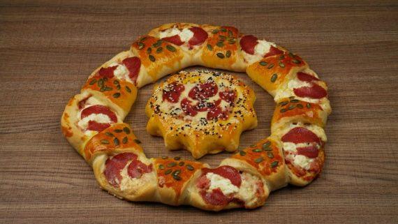 Δείτε ακόμα: H πιο τελεια εύκολη συνταγή για Πίτσα! Κόβουμε στο κέντρο 8 ακτίνες περίπου 10-15 εκατοστών. Περιμετρικά βάζουμε την σάλτσα ντομάτας, ρίγανη, ψιλοκομμένα αλλαντικά, τριμμένο κεφαλοτύρι, κίτρινο τυρί και διπλώνουμε. Στις κοιλότητες τοποθετούμε φέτα και προαιρετικά σαλάμι αέρος. Αλείφουμε την ζύμη με κρόκο αυγού και πασπαλίζουμε με κολοκυθόσπορο ή σουσάμι. Ψήνουμε στους 180 βαθμούς μέχρι να ροδίσει.