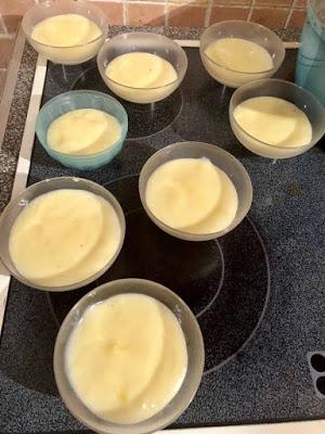 Αρχικά ετοιμάζουμε με τις δοσολογίες που σας δίνω και όπως γράφει επάνω στην συσκευασία προσθέτοντας και την βανίλια την κρέμα και την αδειάζουμε με μία κουτάλα στα μπολάκια μέχρι την μέση . Τα αφήνουμε να κρυώσουν εντελώς .