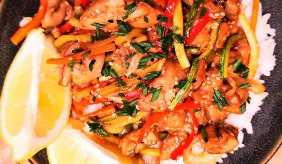 Κόβουμε το κοτόπουλο σε μικρές μπουκιές και το μαρινάρουμε για τουλάχιστον μιάμιση ώρα. Όταν είναι έτοιμο το κοτόπουλο βάζουμε σε ένα αντικολλητικό τηγάνι το σπορέλαιο και σοτάρουμε το κοτόπουλο σε δυνατή φωτιά, μαζί με την μαρινάδα του, μέχρι να εξατμιστούν τα υγρά και να πάρει χρώμα το κοτόπουλο.