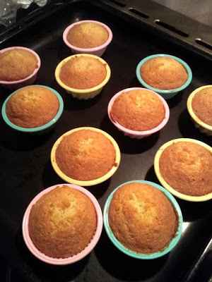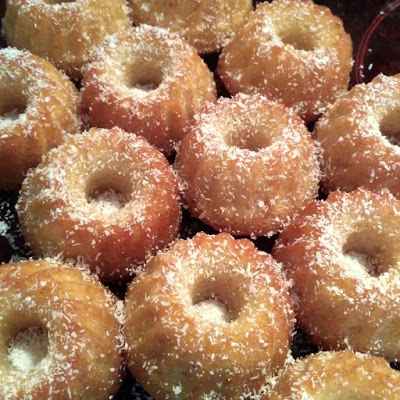 Έβαλα στον κάδο του μίξερ 125γρ Βιτάμ, 1ποτήρι ζάχαρη, 4αβγά,1/2ποτήρι καρύδα, 1σφηνακι κονιάκ, 1ποτηρι φαρίνα up, 5’χτυπημα. Τα έβαλα στις θηκουλες της σιλικόνης και τα έψησα για 25′ στους 180c αέρα. Για το σιροπακι χρειάστηκα 1ποτηρι νερό και 1ποτηρι ζάχαρη.