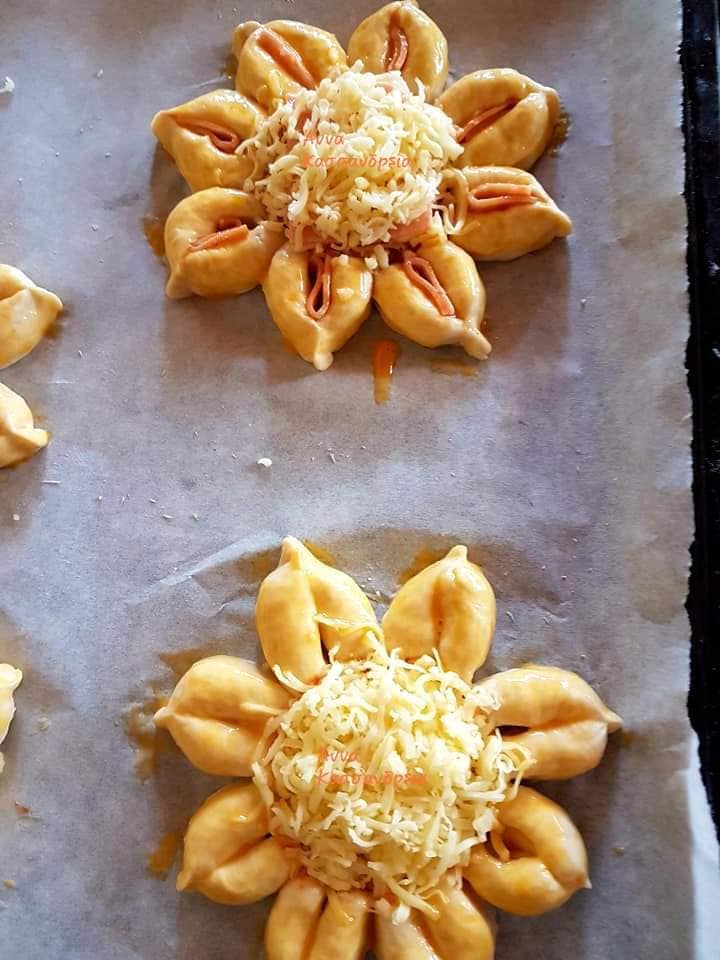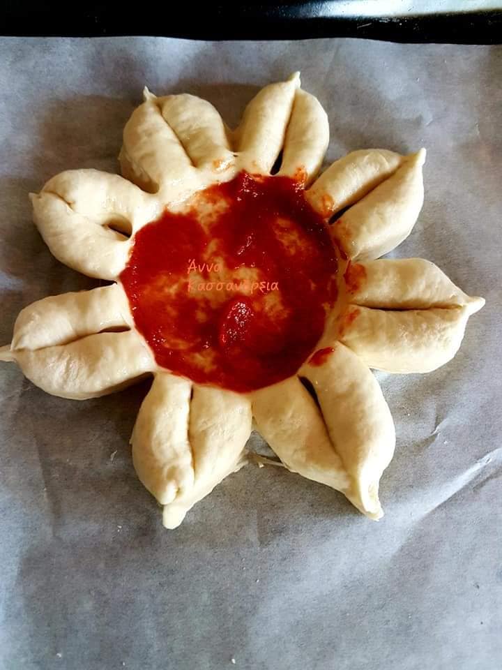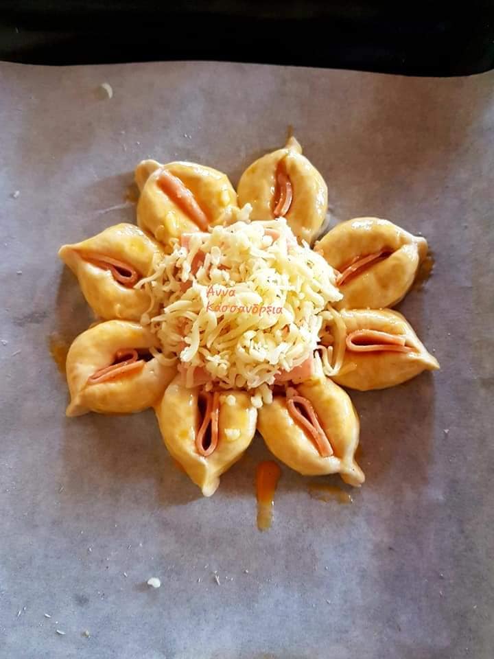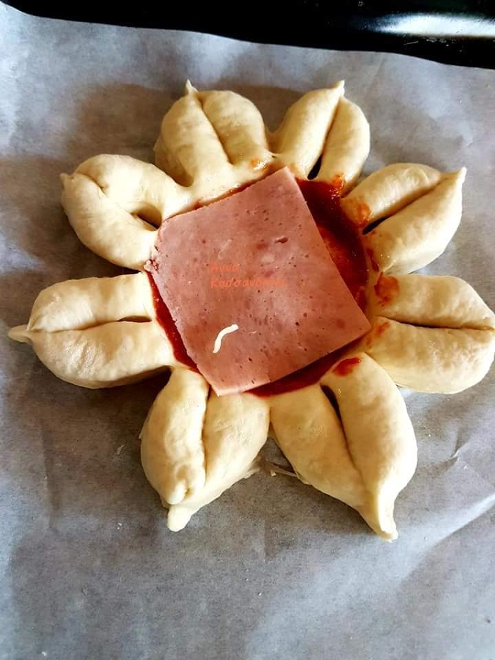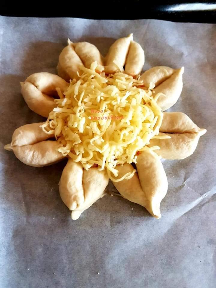 Κοσκινίζουμε το αλεύρι προσθέτουμε το αλάτι , ζάχαρη τη μαγιά και στο τέλος το νερό ζυμώνουμε μία μαλακιά ζύμη και αφήνουμε σκεπάζοντας τη ζύμη στην άκρη. Για μία ώρα για να διπλασιαστεί στη συνέχεια κόβουμε τη ζύμη σε 6 ίσα μπαλάκια και αφήνουμε ξανά για 10 λεπτά να ξεκουραστούν. Μετά Δείτε τις φωτογραφίες βήμα βήμα για τη γέμιση και για το σχήμα του λουλούδι. Το λουλούδι το κόβουμε σε 16 κομμάτια και μετά με τα δάχτυλα διπλώνουμε τα διπλά.