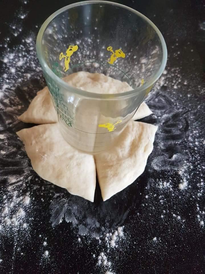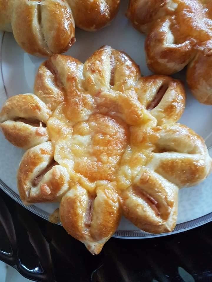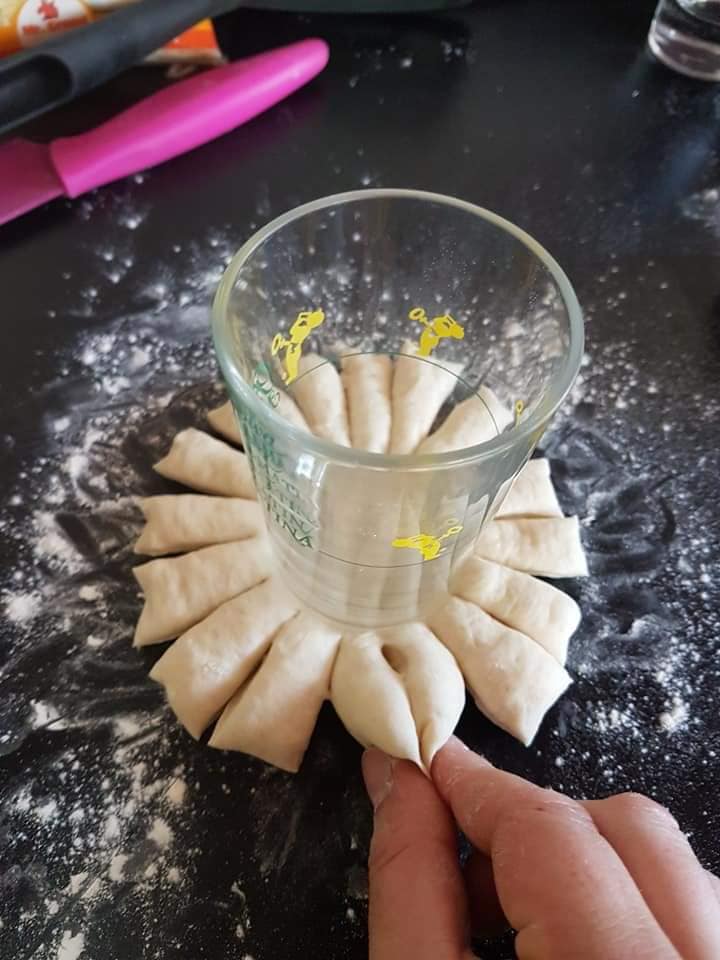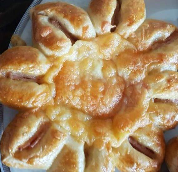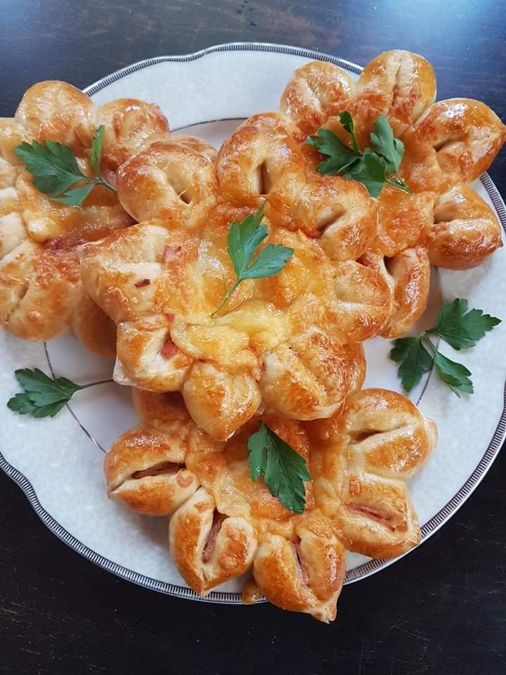 Κοσκινίζουμε το αλεύρι προσθέτουμε το αλάτι , ζάχαρη τη μαγιά και στο τέλος το νερό ζυμώνουμε μία μαλακιά ζύμη και αφήνουμε σκεπάζοντας τη ζύμη στην άκρη. Για μία ώρα για να διπλασιαστεί στη συνέχεια κόβουμε τη ζύμη σε 6 ίσα μπαλάκια και αφήνουμε ξανά για 10 λεπτά να ξεκουραστούν. Μετά Δείτε τις φωτογραφίες βήμα βήμα για τη γέμιση και για το σχήμα του λουλούδι. Το λουλούδι το κόβουμε σε 16 κομμάτια και μετά με τα δάχτυλα διπλώνουμε τα διπλά.