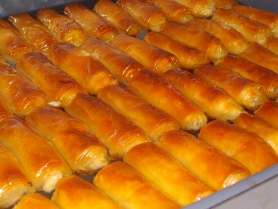 Επαναλαμβάνουμε την ίδια διαδικασία με τις υπόλοιπες λωρίδες και φτιάχνουμε συνολικά 60 ρολά. Ψήνουμε στους 180 στο μεσαίο επίπεδο μέχρι να πάρει το επιθυμητό χρώμα (το ελέγχετε συνεχώς) και μόλις το βγάλουμε το ταψάκι το σιροπιάζουμε….Αν θέλουμε προσθέτουμε στο κάθε κομματάκι και κανέλα.
