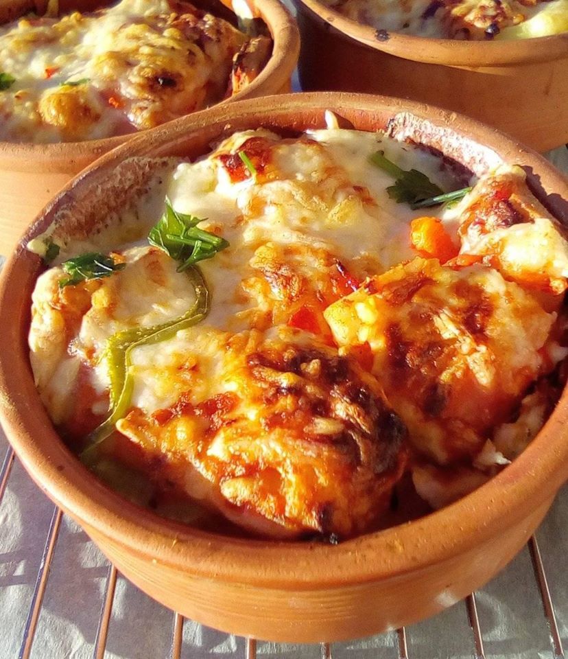 Πλένουμε καθαρίζουμε και κόβουμε σε ροδέλες τις πατάτες. Βάζουμε σπορέλαιο στο τηγάνι και τις τηγανίζουμε και τις τοποθετούμε σε απορροφητικό χαρτί. Παίρνουμε τα πήλινα και τοποθετούμε στο καθένα δυο στρώσεις πατάτες. Βάζουμε σε ένα μπολ 2 κουταλιές βούτυρο 1 φλυντζάνι του τσαγιού λάδι και λίγο νερό και τα ζεσταίνουμε. Ρίχνουμε στα πήλινα πάνω στις πατάτες. Ψιλοκόβουμε το μπέικον και το τσιγαρίζουμε σε ένα τηγανάκι και το τοποθετούμε σε απορροφητικό χαρτί. Συνεχίζουμε, τοποθετούμε μπέικον πάνω στις πατάτες. Τρίβουμε μπόλικο κασέρι στο καθένα,ψιλοκόβουμε πιπεριές πράσινες και κόκκινες, ρίχνουμε μαυροπίπερο και τοποθετούμε στους 200 βαθμούς σε προθερμασμένο φούρνο μέχρι να πάρουν ωραίο χρώμα και να λιώσει το κασέρι. Μπορούμε αντί για μπέικον να βάλουμε μορταδέλα,η ζαμπόν ψιλοκομμένο!