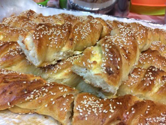 Χωρίζουμε την πίτα μας σε παχιές λωρίδες και τις γυρίζουμε στρίβοντας τις λωρίδες. Αλείφουμε τις λωρίδες μας με τον χτυπημένο κρόκο αυγού που τον έχουμε ανακατέψει με ελάχιστο φρέσκο γάλα. Πασπαλίζουμε με σουσάμι και ψήνουμε το τυρόψωμο στους 180 βαθμούς Κελσίου μέχρι να πάρει χρώμα.