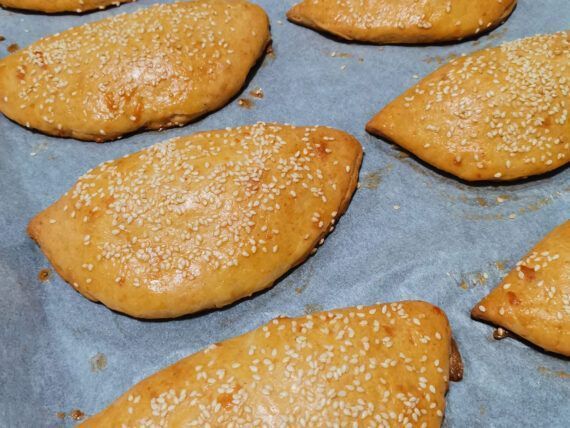 Τις αλείφουμε με 1 αυγό χτυπημένο μαζί με λίγο νερό και πάνω πασπαλίζουμε με σουσάμι. Τοποθετούμε σε λαμαρίνα με αντικολλητικό χαρτί και ψήνουμε σε αντιστάσεις στους 180 βαθμούς για 35′ περίπου να πάρουν ωραίο χρώμα!!